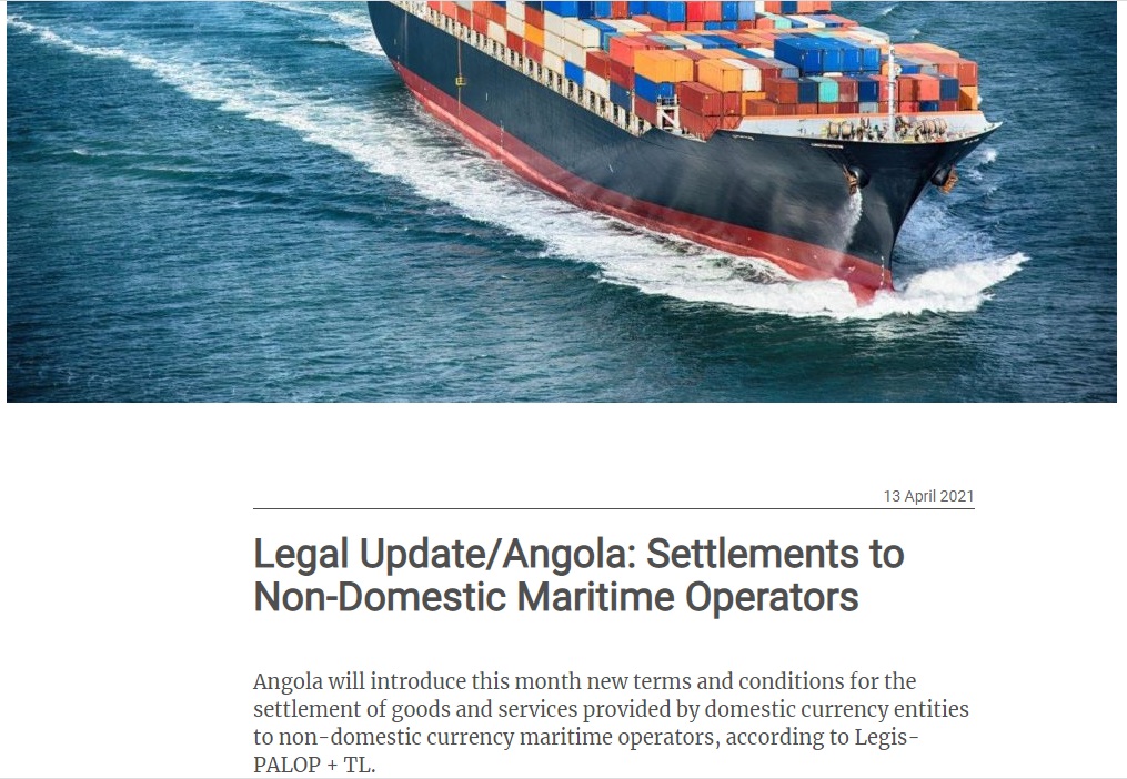 Desde o dia 24 de Abril de 2021 o pagamento de despesas de escala aos prestadores de serviços portuários em Angola deve ser realizado apenas em moeda estrangeira, independentemente de ser realizado pelo operador marítimo ou pelo seu agente de navegação. Os operadores marítimos devem liquidar os valores devidos aos prestadores de serviços portuários através de uma das seguintes formas: transferência bancária em moeda estrangeira para uma conta bancária domiciliada em Angola e titulada pelo prestador de serviços portuários ou pelo seu agente de navegação, para subsequente crédito ao prestador de serviços portuários; ou transferência de uma conta de não residente cambial titulada pelo operador marítimo, denominada em moeda estrangeira, domiciliada num banco sedeado em Angola. Quer as Instituições Financeiras Bancárias domiciliadas em Angola (Bancos Comerciais), quer os prestadores de serviços portuários residentes cambiais, os operadores marítimos não residentes cambiais e os agentes de navegação residentes cambiais devem cumprir as obrigações estabelecidas pelo Aviso n.º 2/21 de 24 de Março, sob pena de multas que ascendem, respectivamente, a cerca de USD 240 000 (150 000 000 Kwanzas) e a a cerca de USD 30 000 (21 120 000 Kwanzas).