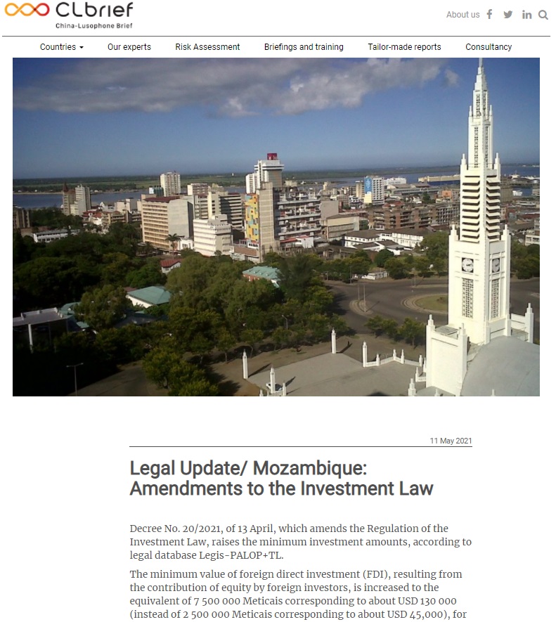 Desde o dia 13 de Abril de 2021 o valor mínimo de investimento directo estrangeiro (IDE) em Moçambique, resultante do aporte de capitais próprios dos investidores estrangeiros, foi aumentado para o equivalente a 7 500 000 Meticais correspondente a cerca de USD 130 000 (em vez de 2 500 000 Meticais correspondente a cerca de USD 45 000), para efeitos específicos de transferência de lucros para o exterior e do capital investido reexportável. A partir desta data, de acordo com a alteração operada pelo Decreto n.º 20/2021, de 13 de Abril, passa a ser igualmente elegível ao direito de transferência de lucros e do capital investido reexportável, o investidor estrangeiro cuja actividade reúna, pelo menos, um dos seguintes requisitos: • Seja gerador de volume de vendas anual no mínimo de 22 500 000 Meticais (cerca de USD 400 000), a partir do terceiro ano de actividade; • As exportações anuais, de bens ou serviços, sejam no mínimo no valor equivalente a 4 500 000 Meticais correspondente a cerca de USD 81 000 (em vez de 1 500 000 Meticais correspondente a cerca de USD 27 000); • Crie e mantenha emprego directo para pelo menos vinte e cinco trabalhadores nacionais, inscritos no sistema de segurança social a partir do segundo ano de actividade.