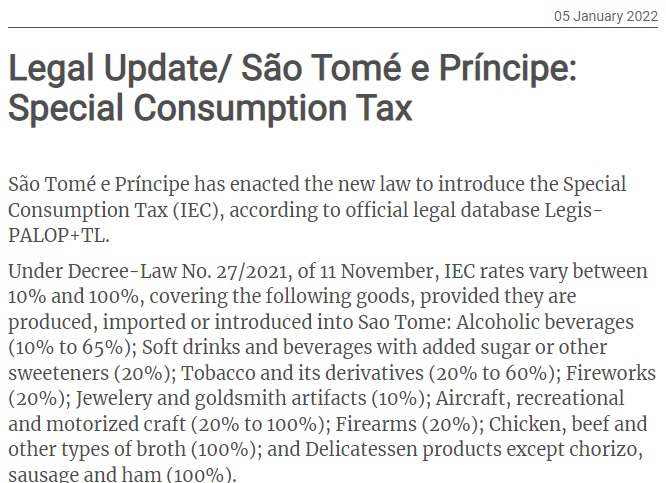A partir de 12 de Novembro, o Imposto Especial Sobre o Consumo (IEC), cujas taxas variam entre 10% e 100%, passou a abranger bens produzidos, importados ou introduzidos no território são-tomense, ainda que provenientes de actividades ilícitas, tais como bebidas alcoólicas, refrigerantes, tabaco, fogo-de-artifício, artefactos de joalharia e de ourivesaria, aeronaves, embarcações de recreio e motorizadas e armas de fogo.