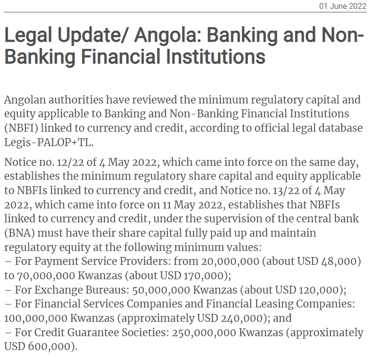 A partir dos dias 4 e 11 de Maio de 2022, respectivamente, com a entrada em vigor dos Avisos n.º 12/22 e n.º 13/22 , as Instituições Financeiras Não Bancárias ligadas à moeda e crédito, sob supervisão do Banco Nacional Angola (BNA) devem ter o seu Capital Social integralmente realizado e manter Fundos Próprios Regulamentares nos seguintes valores mínimos: