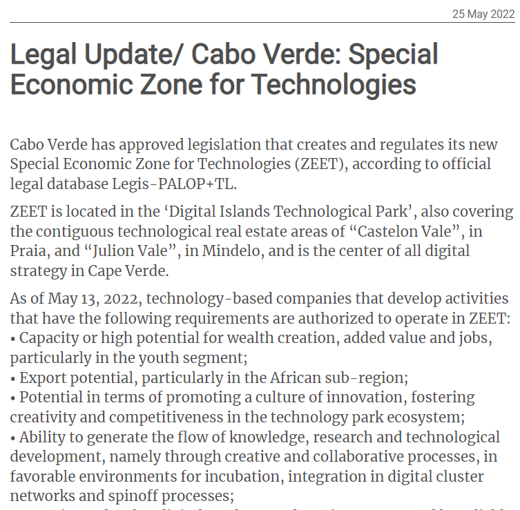 A partir de 13 de Maio de 2022, com a entrada em vigor do Decreto-Lei n.º 15/2022, estão autorizadas a operar na Zona Económica Especial para Tecnologias (ZEET) que se situa no Parque Tecnológico Arquipélago Digital abrangendo zonas contíguas em Mindelo, empresas de base tecnológico que podem beneficiar, designadamente, dos seguintes incentivos fiscais e aduaneiros, financeiros e sociais: