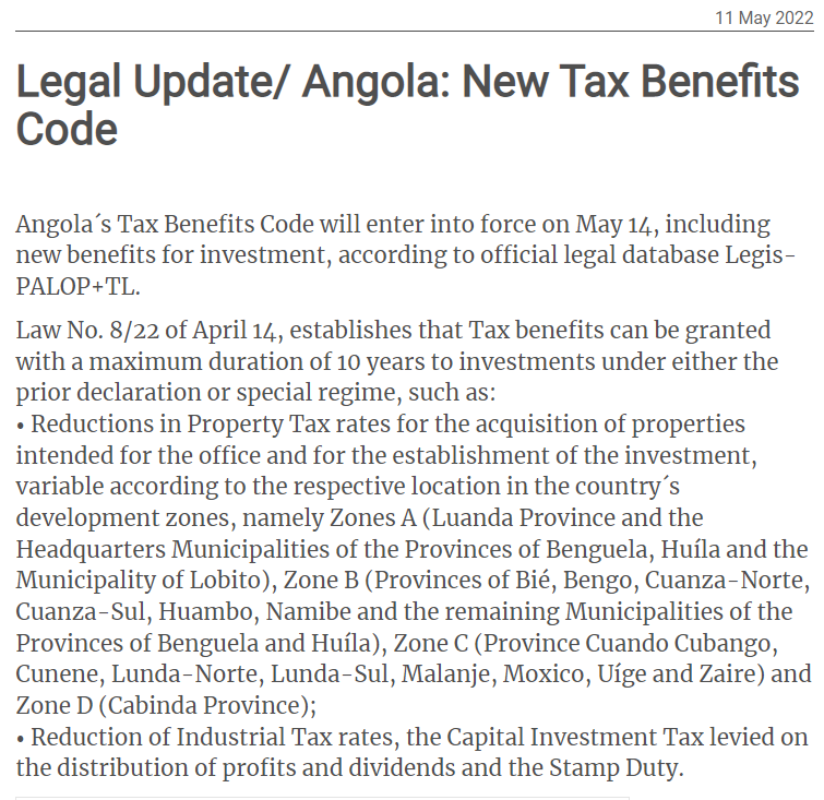 A partir do dia 14 de Maio de 2022, com a entrada em vigor da Lei n.º 8/22 de 14 de Abril, que aprova o Código dos Benefícios Fiscais, podem ser atribuídos benefícios fiscais ao investimento tais como: • Benefícios fiscais com a duração máxima de 10 anos aplicáveis aos investimentos enquadrados quer no regime de declaração prévia quer no regime especial, tais como: o Reduções das taxas de Imposto Predial pela aquisição dos imóveis destinados ao escritório e ao estabelecimento do investimento, variáveis conforme a respectiva localização nas zonas de desenvolvimento em que o país se organiza, a saber, Zonas A (Província de Luanda e os Municípios-Sede das Províncias de Benguela, Huíla e o Município do Lobito), Zona B (Províncias do Bié, Bengo, Cuanza-Norte, Cuanza-Sul, Huambo, Namibe e os restantes Municípios das Províncias de Benguela e da Huíla), Zona C (Província do Cuando Cubango, Cunene, Lunda-Norte, Lunda-Sul, Malanje, Moxico, Uíge e Zaire ) e Zona D (Província de Cabinda); e ainda o Redução das taxas de Imposto Industrial, do Imposto sobre a Aplicação de Capitais que incide sobre a distribuição de lucros e dividendos e do Imposto de Selo.