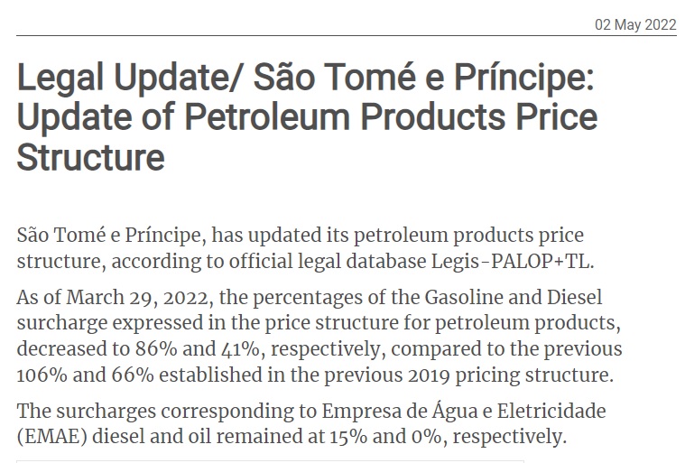 A partir do dia 29 de Março de 2022, com a entrada em vigor do Decreto n.º 9/2022, as percentagens da sobretaxa de Gasolina e Gasóleo expresso na estrutura de preços por produtos petrolíferos, diminuem, respectivamente, para 86% e 41%, face às anteriores 106% e 66% estabelecidas na anterior estrutura de preços de 2019. Já as sobretaxas correspondentes a Gasóleo Empresa de Água e Eletricidade (EMAE) e a Petróleo mantêm-se, respectivamente, em 15% e 0%. Os Direitos de Importação da Gasolina, Gasóleo, Gasóleo EMAE e Petróleo mantêm-se em 5%. No que respeita a outros custos adicionais mantêm-se igualmente sem alteração desde 2019 as percentagens relativamente ao fundo rodoviário, emolumento e guias, agência do despachante, Empresa Nacional de Combustíveis e Óleos (ENCO), margem grossista, margem distribuição, margem distribuição Príncipe e margem retalhista.