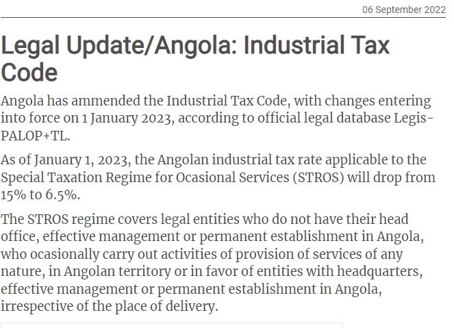 A partir de 1 de Janeiro de 2023, com a entrada em vigor da Lei n.º 27/22 de 22 de Agosto, que altera o Código de Imposto Industrial, a taxa do imposto industrial angolano aplicável ao Regime Especial de Tributação de Serviços Acidentais baixará de 15% para 6,5%.