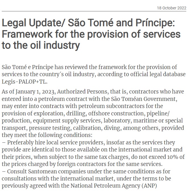A partir de 1 de Janeiro de 2023, com a entrada em vigor do Decreto-Lei n.º 22/2022 de 14 de Setembro, as Pessoas Autorizadas, ou seja, os contratantes que tenham celebrado contrato petrolífero com o Governo Sãotomense, poderão celebrar contratos com subcontratantes petrolíferos para prestação de serviços de exploração, perfuração, construções offshore, pipeline/serviços de produção, serviços de fornecimento de equipamentos, de laboratório, de transporte marítimo ou especial, de teste de pressão, de calibração, de mergulho, entre outros, desde que cumpram as seguintes condições: - Contratem, de preferência, prestadores de serviços locais, na medida em que os serviços que prestam sejam idênticos aos que estejam disponíveis no mercado internacional e os seus preços, quando sujeitos aos mesmos encargos fiscais, não sejam superiores a 10% dos preços praticados por empreiteiros estrangeiros para idênticos serviços. - Consultem as empresas Santomenses nas mesmas condições das consultas ao mercado internacional, nos termos a acordar previamente com a Agência Nacional do Petróleo (ANP) https://www.anp-stp.gov.st/index.php/pt/ . Os subcontratantes petrolíferos deverão obedecer ao seguinte sob pena de coima no montante de USD 6 000: - Efectuar registo junto da ANP, ainda que os serviços sejam prestados fora do território nacional, mediante requerimento dirigido ao Director Executivo da ANP, a qual emite um certificado de registo que qualifica os requerentes como Subcontratantes Petrolíferos e autorizados a prestarem serviços de apoio à indústria petrolífera nacional nesta qualidade; - Submeter uma cópia do contrato entre as Pessoas Autorizadas ou Associadas e os Subcontratantes Petrolíferos à ANP no prazo de 10 dias.