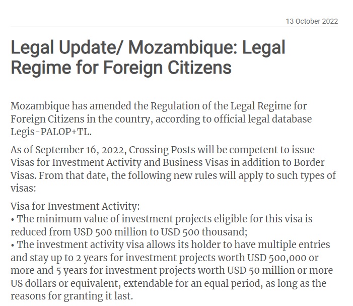A partir de 16 de Setembro de 2022, com a entrada em vigor do Decreto n.º 46/2022 de 16 de Setembro, os Postos de Travessia passam a ser competentes para emitir Vistos para Actividade de Investimento e Vistos de Negócio para além de Vistos de Fronteira. A partir de tal data passam a ser aplicáveis a tais tipos de vistos as seguintes novas regras: • Visto para Actividade de Investimento: o O valor mínimo dos projectos de investimento elegíveis para concessão deste visto baixa de USD 500 milhões para USD 500 mil; o O visto para actividade de investimento permite ao seu titular múltiplas entradas e permanência até 2 anos para projectos de investimentos de valor igual ou superior a 500 mil dólares norte-americanos e 5 anos para projectos de investimentos de valor igual ou superior a 50 milhões de dólares norte-americanos ou equivalente, prorrogáveis por igual período, enquanto perdurarem as razões da sua concessão.