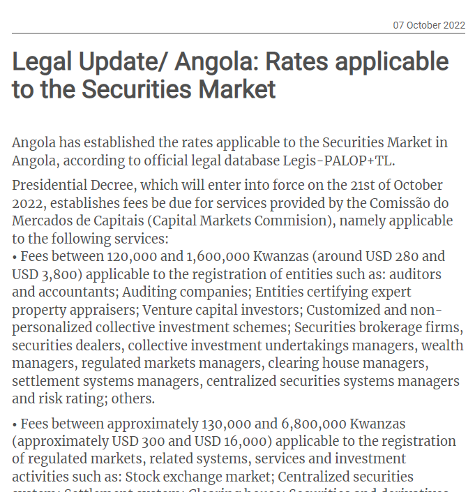 • Taxas entre cerca de 130 000 e 6 800 000 Kwanzas (cerca de USD 300 e USD 16 000) aplicáveis ao registo de mercados regulamentados, sistemas conexos, serviços e actividades de investimento tais como: Mercado de bolsa de valores, Sistema centralizado de valores mobiliários, Sistema de liquidação, Câmara de compensação, Serviços e actividades de investimento em valores mobiliários e instrumentos derivados, incluindo consultoria sobre a estrutura de capital, a estratégia industrial e questões conexas, bem como sobre a fusão e a aquisição de empresas, entre outros. É admissível o pagamento do valor das taxas em seis prestações mensais quando a natureza do serviço prestado ou a real situação patrimonial do sujeito passivo o justifique.