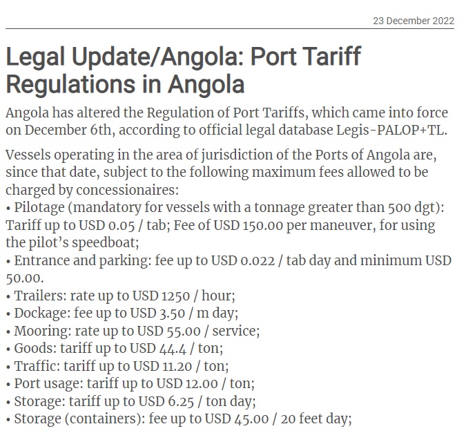 A partir do dia 6 de Dezembro de 2022, com a entrada em vigor do Decreto Executivo conjunto n.º 634/22, de 6 de Dezembro, que aprova o Regulamento de Tarifas Portuárias de Angola, as embarcações a operar na área de jurisdição dos Portos de Angola estão sujeitas, designadamente, às seguintes taxas máximas permitidas a cobrar pelas concessionárias: