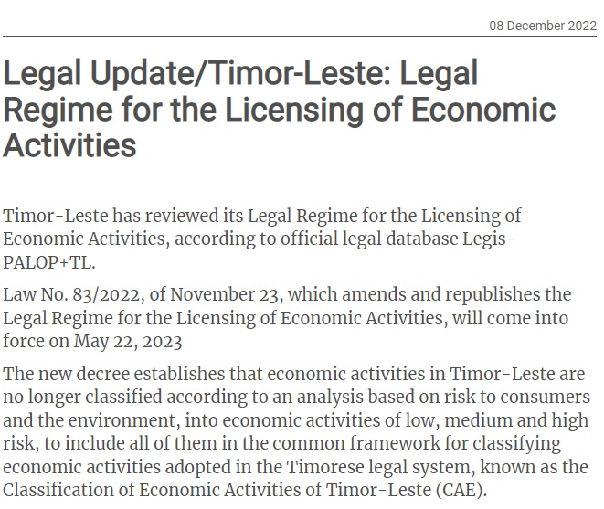A partir do dia 22 de Maio de 2023, com a entrada em vigor do Decreto-Lei n.º 83/2022, de 23 de Novembro, que altera e republica o Regime Jurídico do Licenciamento de Atividades Económicas, as actividades económicas em Timor-Leste deixarão de estar classificadas segundo uma análise feita com base no risco para os consumidores e para o ambiente, em atividades económicas de baixo, médio e alto risco, passando a incluir-se todas no quadro comum de classificação das atividades económicas adotadas no ordenamento timorense, denominado por Classificação das Atividades Económicas de Timor-Leste (CAE).