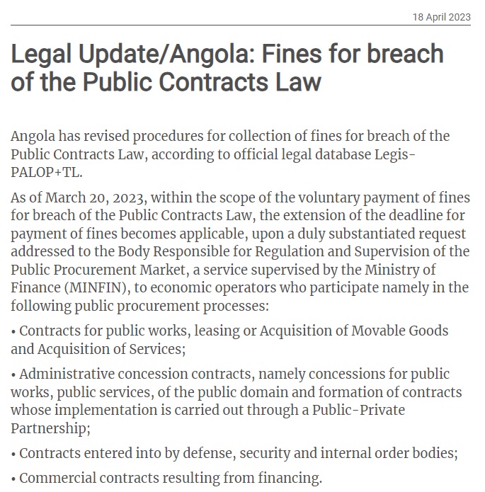 A partir do dia 20 de Março de 2023, com a entrada em vigor do Decreto Presidencial n.º 77/23, de 20 de Março, no âmbito do pagamento voluntário de coimas por transgressão da Lei dos Contratos Públicos, aprovada pela Lei n.º 41/20, de 23 de Dezembro, passa a ser aplicável a prorrogação do prazo de pagamento das coimas, mediante pedido devidamente justificado dirigido ao Órgão Responsável pela Regulação e Supervisão do Mercado da Contratação Pública, serviço superintendido pelo Ministério das Finanças (MINFIN), aos operadores económicos que participam designadamente nos seguintes processos de contratação pública: