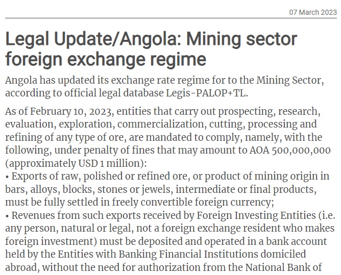 A partir do dia 10 de Fevereiro de 2023, com a entrada em vigor do Aviso n.º 2/23, de 9 de Fevereiro, do Banco Nacional de Angola (BNA), as entidades que realizam reconhecimento, prospecção, pesquisa, avaliação, exploração, comercialização, lapidação, beneficiamento e refinação de qualquer tipo de minério, quer por agregação de valor ou por mudança de posição pautal do mineral original, bem como a comercialização de minerais ou produtos de origem mineira, passam a ser obrigadas a cumprir, designadamente, designadamente o seguinte sob pena de multas que poderão ascender até 500 000 000 Kwanzas (cerca de USD 1 000 000):
