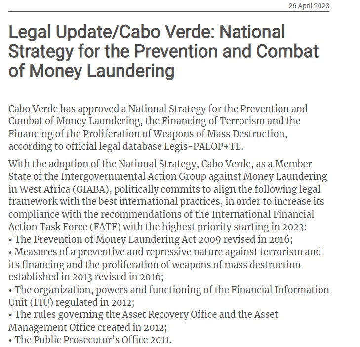 Com a adopção, em 4 de Abril de 2023, da Estratégia Nacional de Prevenção e Combate à Lavagem de Capitais, ao Financiamento do Terrorismo e ao Financiamento da Proliferação das Armas de Destruição em Massa, através da Resolução n.º 24/2023, de 3 de Abril, Cabo Verde, enquanto Estado Membro do Grupo Intergovernamental de Acção contra a Lavagem de Capitais na África Ocidental (GIABA), assume o compromisso político de alinhar o seguinte quadro legal às melhores práticas internacionais, de forma a aumentar a sua conformidade às recomendações do Grupo de Acção Financeira Internacional (GAFI) com máxima prioridade no ano de 2023: