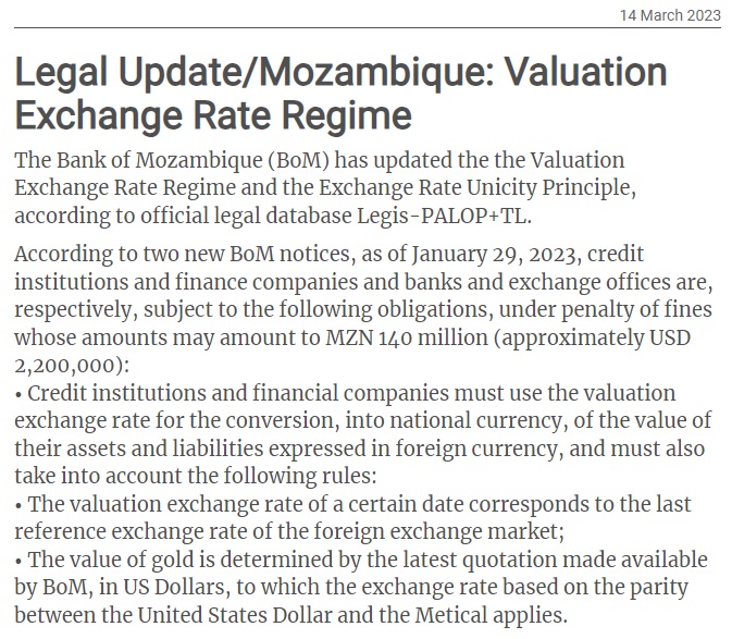 A partir do dia 29 de Janeiro de 2023, com a entrada em vigor dos Avisos n.º 6/GBM/2022 e n.º 7/GBM/2022, ambos de 30 de Dezembro de 2022, do Banco de Moçambique (BdM), as instituições de crédito e sociedades financeiras e os bancos e casas de câmbio estão, respectivamente, sujeitos designadamente às seguintes obrigações, sob pena de multas cujos valores podem ascender a 140 milhões MZN (cerca de USD 2 200 000):