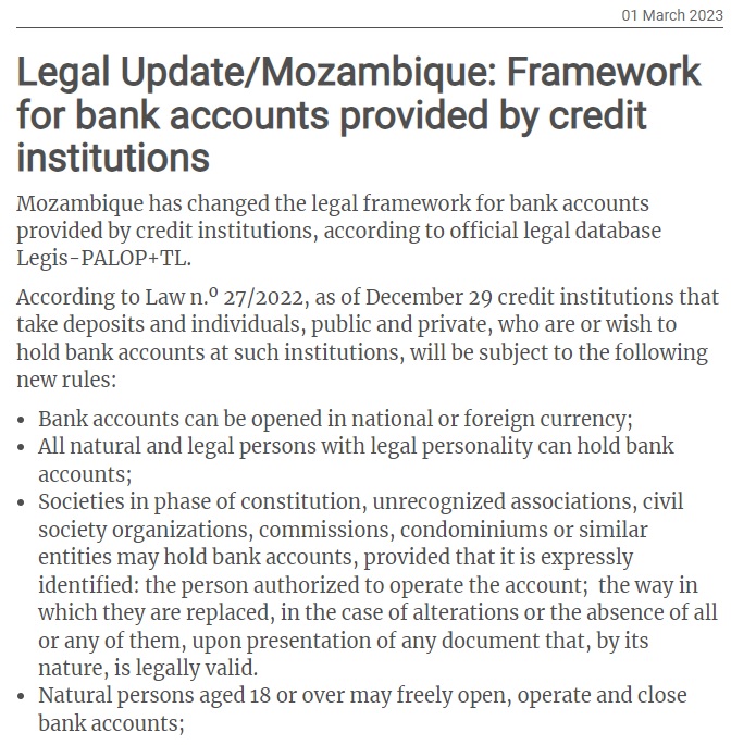 A partir do dia 29 de Dezembro de 2022, com a entrada em vigor da Lei n.º 27/2022, de 29 de Dezembro, as instituições de crédito que captam depósitos e as pessoas singulares e colectivas, públicas e privadas, que sejam ou desejam ser titulares de contas bancárias nas instituições de crédito que captam depósitos em Moçambique, passam a estar sujeitas, designadamente, às seguintes novas regras: