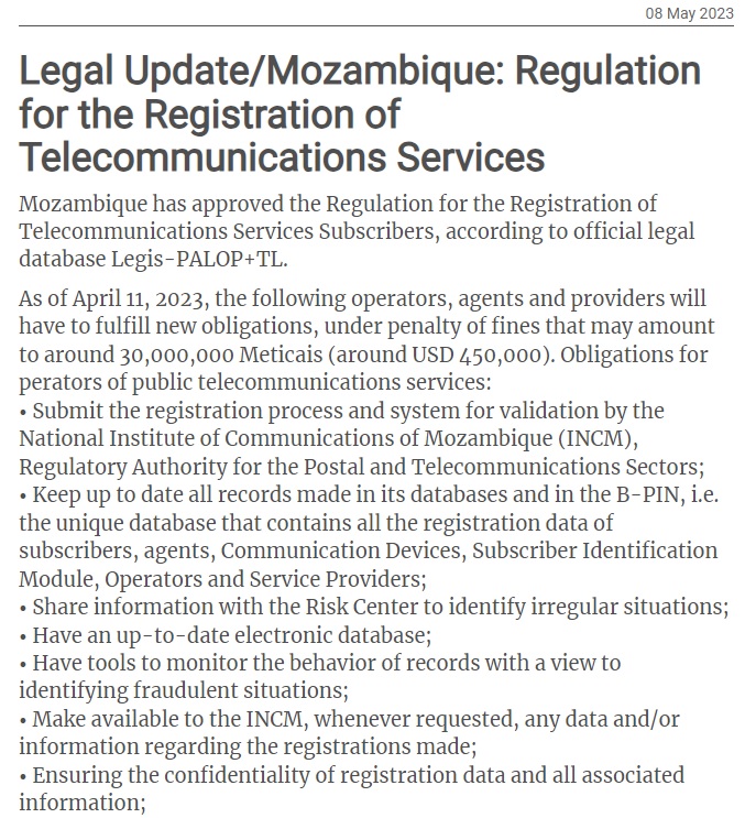 A partir de 11 de Abril de 2023, com a entrada em vigor do Decreto n.º 13/2023, de 11 de Abril, os seguintes operadores, agentes e prestadores passam a ter de cumprir, designadamente, as seguintes obrigações, sob pena de multas que poderão ascender até cerca de 30 000 000 Meticais (cerca de USD 450 000):