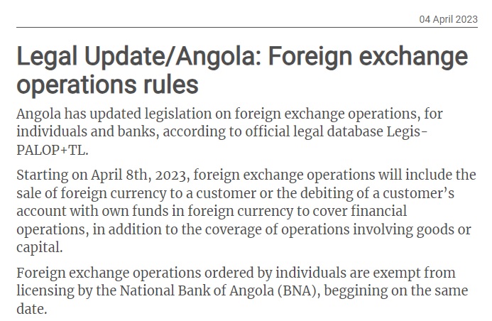 A partir do dia 8 de Abril de 2023, com a entrada em vigor do Aviso n.º 3/23 de 9 de Março, do Banco Nacional de Angola (BNA), passa a ser abrangida enquanto operação cambial a venda de moeda estrangeira a um cliente ou o débito da conta de um cliente com recursos próprios em moeda estrangeira para a cobertura de operações financeiras, para além da cobertura de operações de invisíveis correntes, de mercadorias ou de capitais. A partir do dia 8 de Abril de 2023, as operações cambiais ordenadas por pessoas singulares estão isentas de licenciamento pelo BNA. Já a intermediação das operações cambiais apenas pode ser efectuada por uma Instituição Financeira Bancária autorizada a exercer o comércio de câmbios, as quais devem cumprir novas regras do BNA, sob pena de prática de infração grave punível com multa até 21 120 000 Kwanzas (cerca de USD 40 000), e sanções acessórias que, entre outras, podem incluir a revogação temporária ou definitiva da licença para o exercício do comércio de câmbios, ou a inibição temporária ou definitiva de exercício de funções de um ou mais membros dos órgãos de administração ou de direcção das Instituições incumpridoras.   (Artigo completo cuja fonte é a Coordenação Regional do Legis-PALOP+TL publicado no dia 4 de Abril de 2023 pelo CLBrief – China Lusophone Brief disponível em EN aqui).
