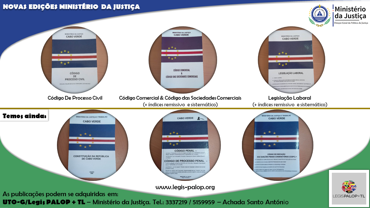 Temos a satisfação de anunciar que a Unidade Legis-PALOP+TL em Cabo Verde, coordenada pelo Dr. Adriano Afonso, organizou as seguintes novas Edições do Ministério da Justiça: